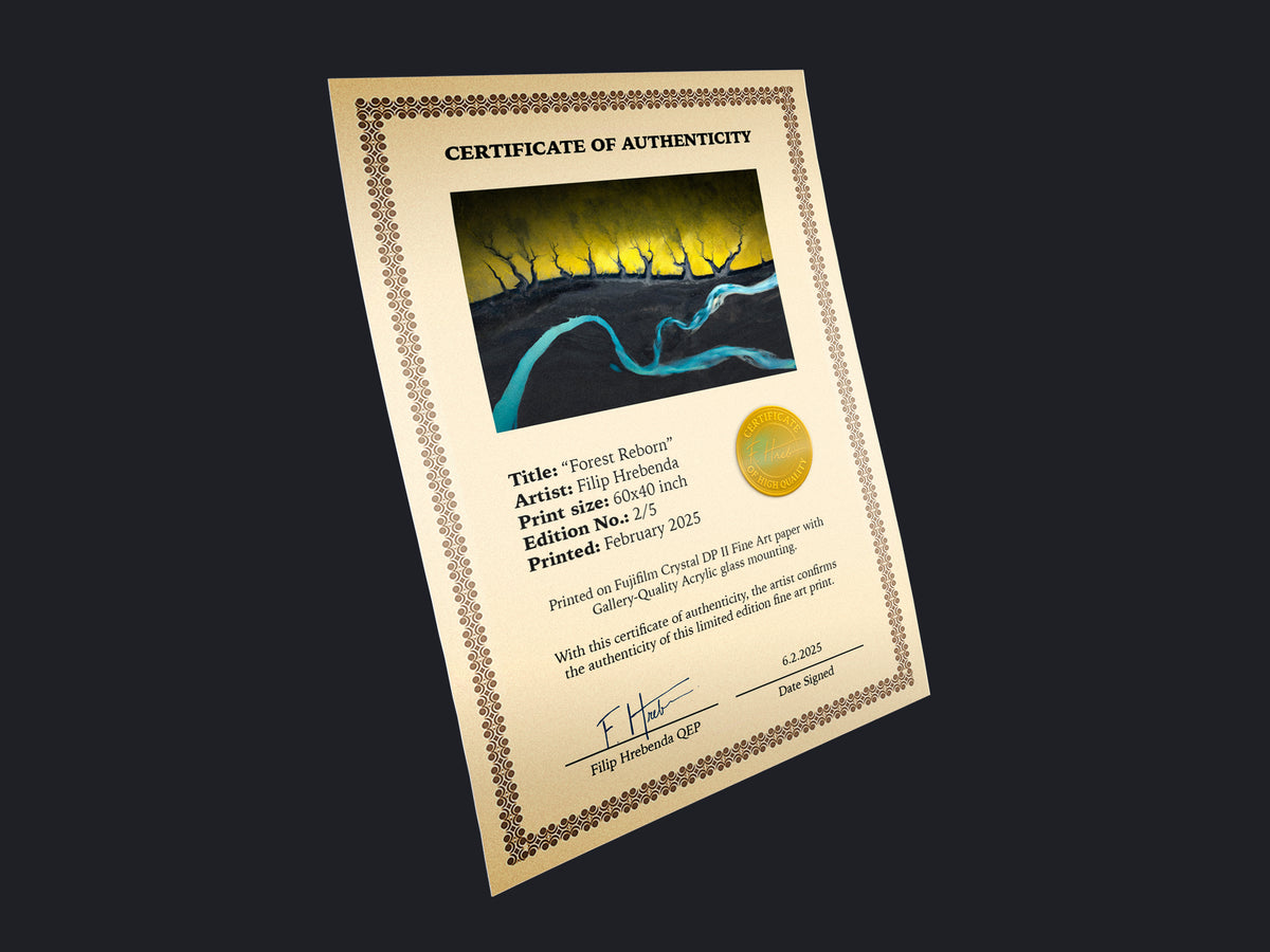 With every artwork, you will receive both printed and digital certificate of authenticity, which guarantees that you have a unique original piece by the author. Each certificate includes the title of the photograph, the materials on which the artwork was printed, the author’s name, the date the piece was created, the author’s original protective seal, and the author’s handwritten signature.
